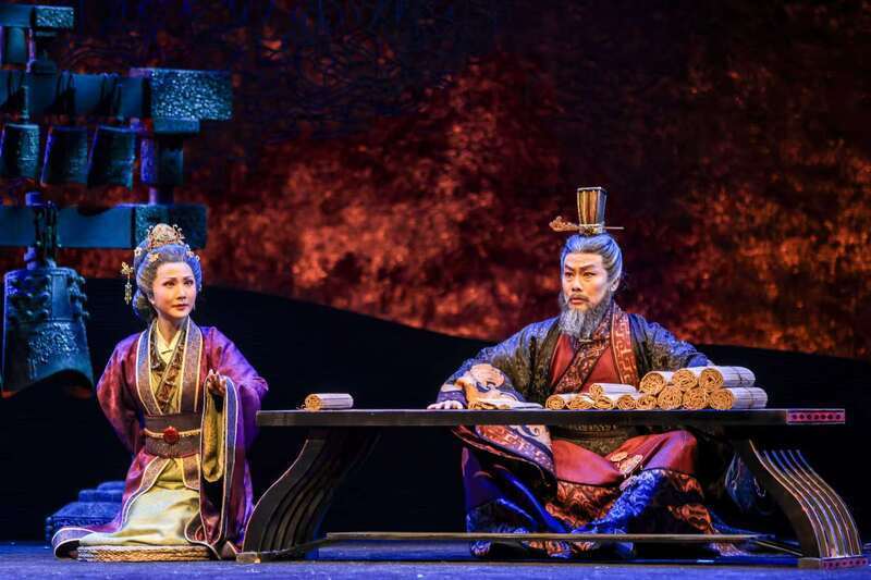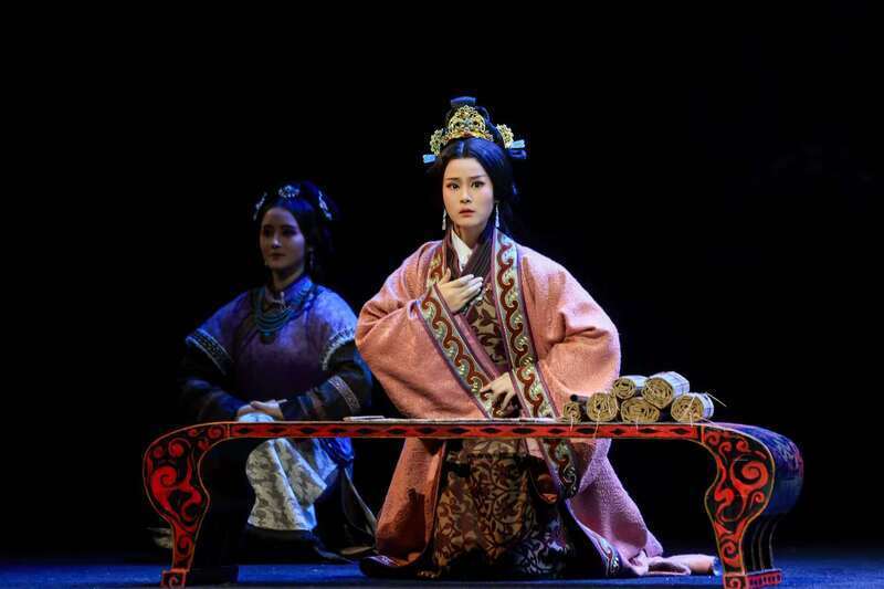 剧中,刘颖的表演极具张力。唱腔时而如泣如诉,道尽思乡之苦;时而高亢坚定,迸发文化自信。第三场“教书育人”成为全剧高光时刻:蔡文姬在异乡教授孩童,思绪穿越时空与父亲蔡邕隔空对话,随后带领孩童齐声吟诵汉诗,舞台上的书写动作与光影交织,形成强烈的文化意象,将全剧推向高潮。这一幕,也因其极富感染力的视觉呈现,被认为极具“出圈”潜力。