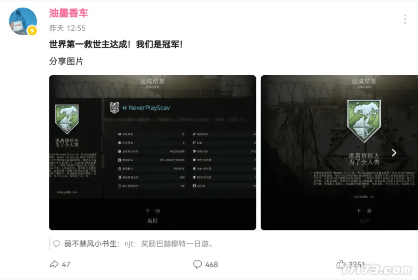 12月4日,中国玩家油墨香车达成了《逃离塔科夫》游戏首个完美结局“救世主”的通关成就。
