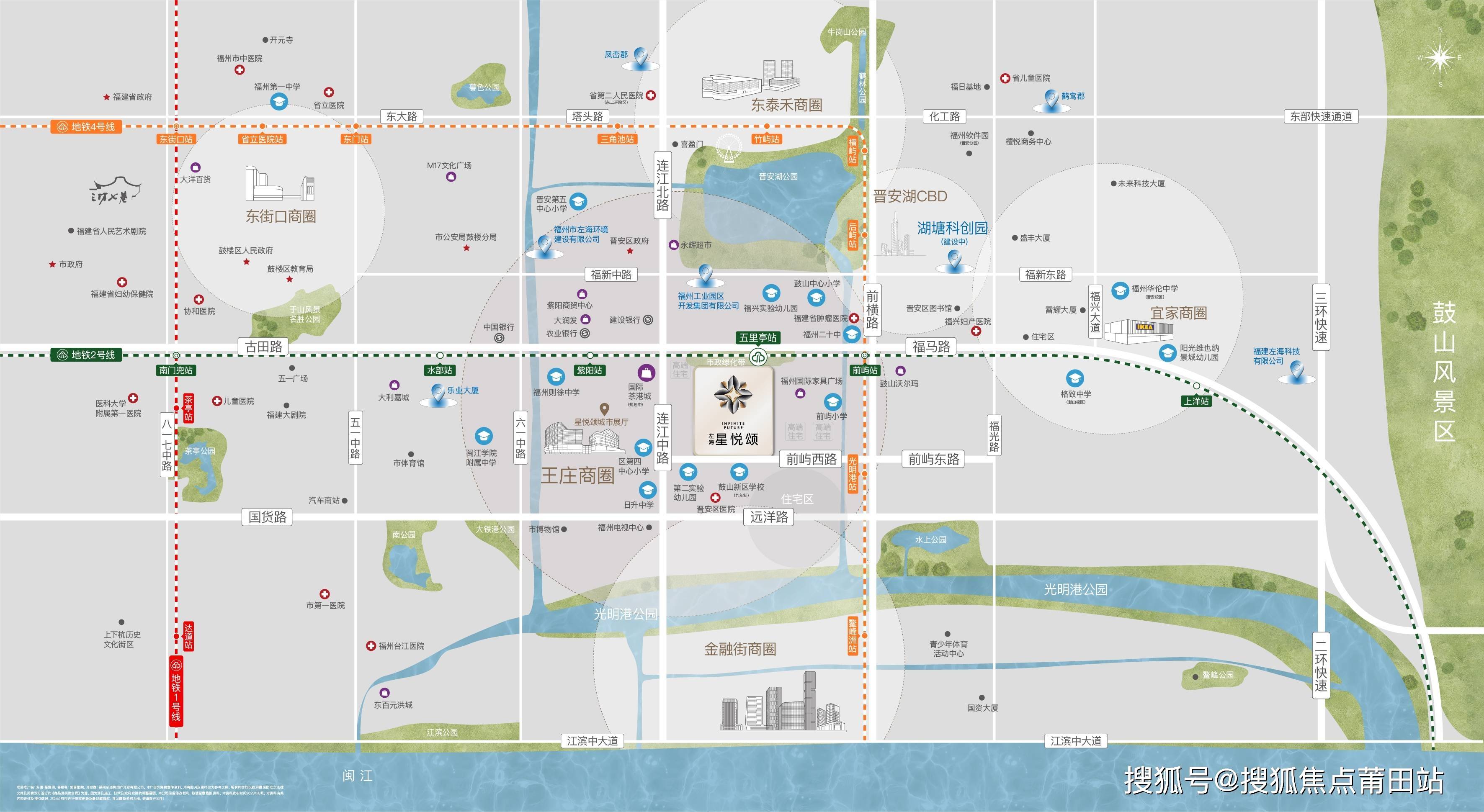 项目周边晋安湖公园、牛岗山公园、鹤林生态公园、光明港公园,围合生态公园群落,造就都会里的诗意栖居地。
