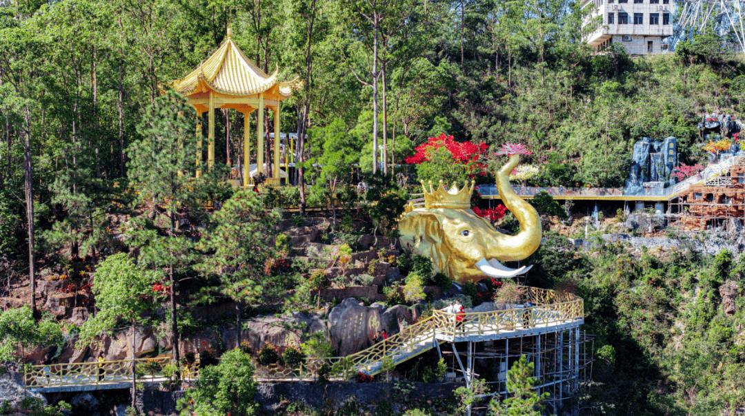 其中,花博园研学实践基地建设木本花卉展示区、果树展示区、林下南药展示区、户外教学区和露营体验区等参观体验项目;丛林科普研学基地项目建设自然科普馆、水上乐园、丛林瀑布、魔网户外拓展活动区和穿越水帘洞、小火车等板块互动体验项目;云顶栈道研学基地建设从爱心平台至吉象亭长约520米的栈道,沿途经过18个研学科普点位,包括屋、新华书店、动植物科普长廊、南药科普长廊、自然科普长廊、10个研学活动室以及云端天梯、金象捧莲、四季长廊等项目点位。
