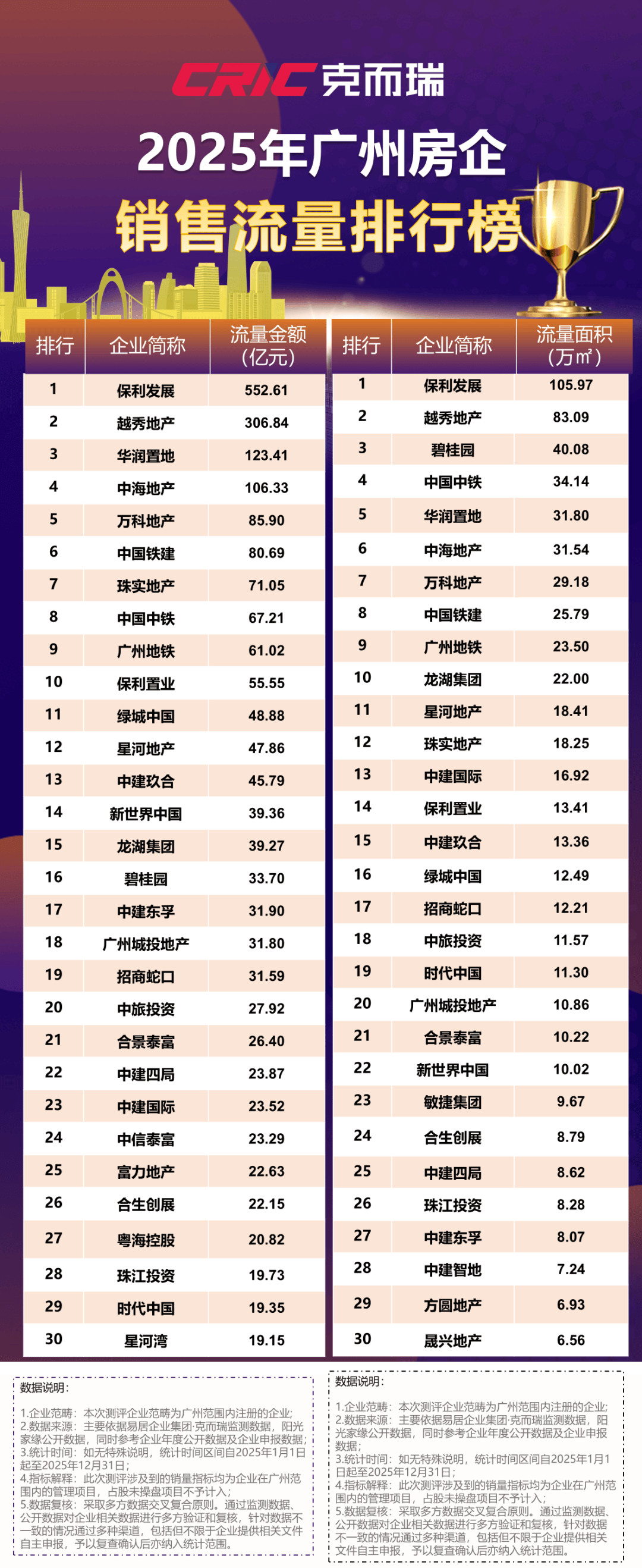 以229.17亿元权益金额,308.22亿元全口径金额,306.84亿元流量金额,83.09万㎡流量面积包揽四榜排行亚军;2025年越秀地产持续深耕广州市场,旗下项目越秀观樾、越秀天河和樾府、越秀·桂悦东晓等项目在中心四区取得了优异的销售表现。