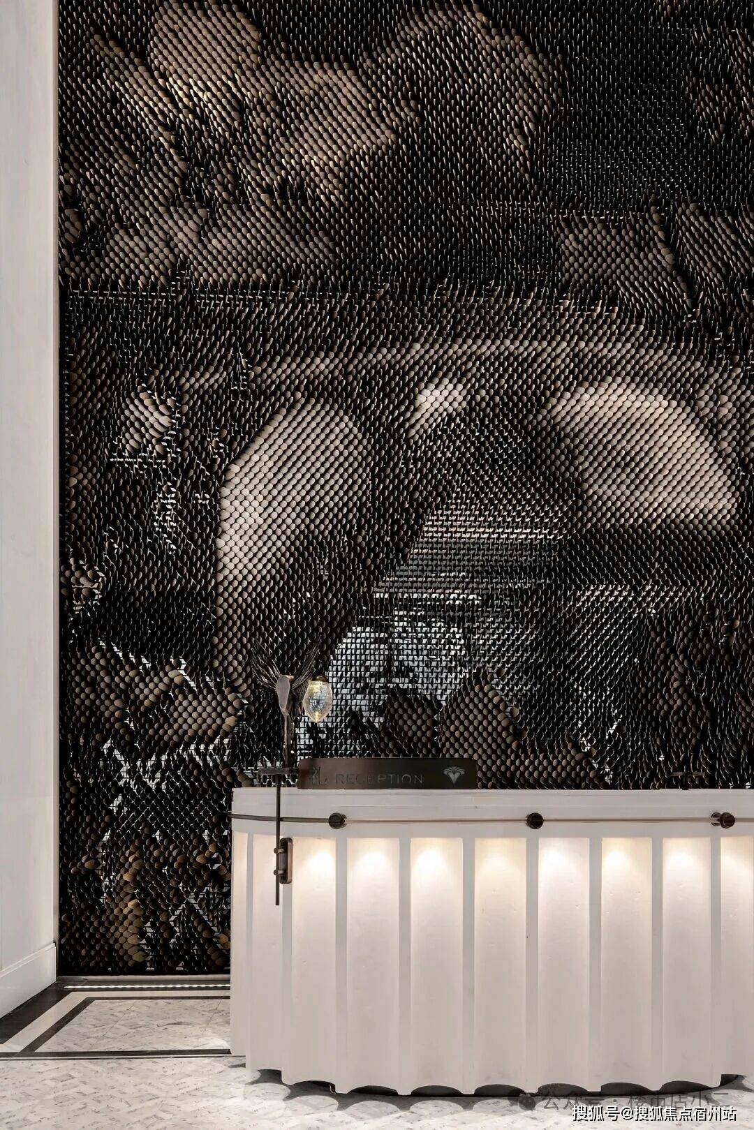 接待台背景墙采用21872枚鳞片装置,经精密参数化设计、组装,展现上海在地题材。