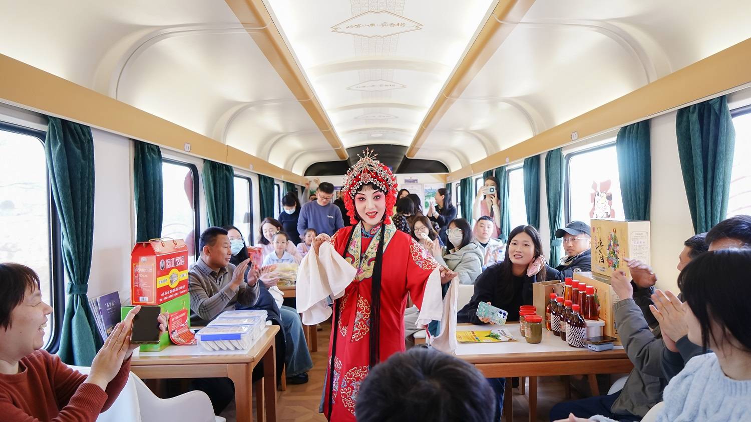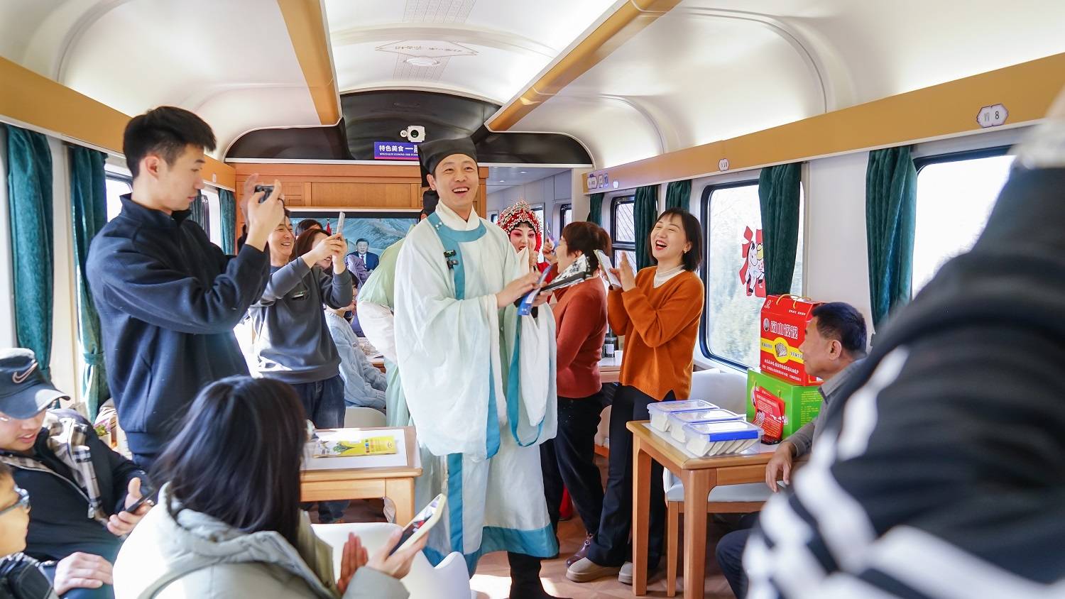 此外,此次活动特别邀请长清本土山东梆子剧团,在特色美食餐车开展专场展演,演员们高亢激昂的唱腔、韵味十足的表演赢得现场乘客阵阵喝彩。演出间隙,演员还向旅客详细介绍长清非遗传统民俗演艺特色及曲目背景,让乘客在欣赏精彩表演的同时,深入了解长清非遗的独特魅力,推动非物质文化遗产活态传承。
