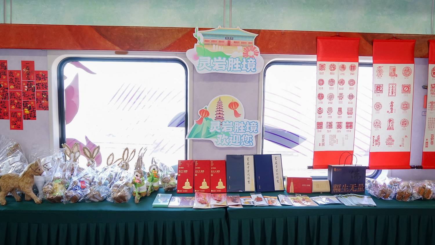 活动深度联动灵岩胜境旅游区设置灵岩风光专区,以“灵岩小书生”“灵岩年货郎”两大核心IP为载体,开展丰富多样的互动活动。列车上,“灵岩小书生”现场发起诗词对答,答对的游客可直接获得灵岩胜境门票,以趣味形式传递灵岩寺千年文化底蕴。两大IP还联合展示灵岩文创产品,将古刹文化转化为可触、可感、可带走的创意好物,让文化“带得走、记得住”。