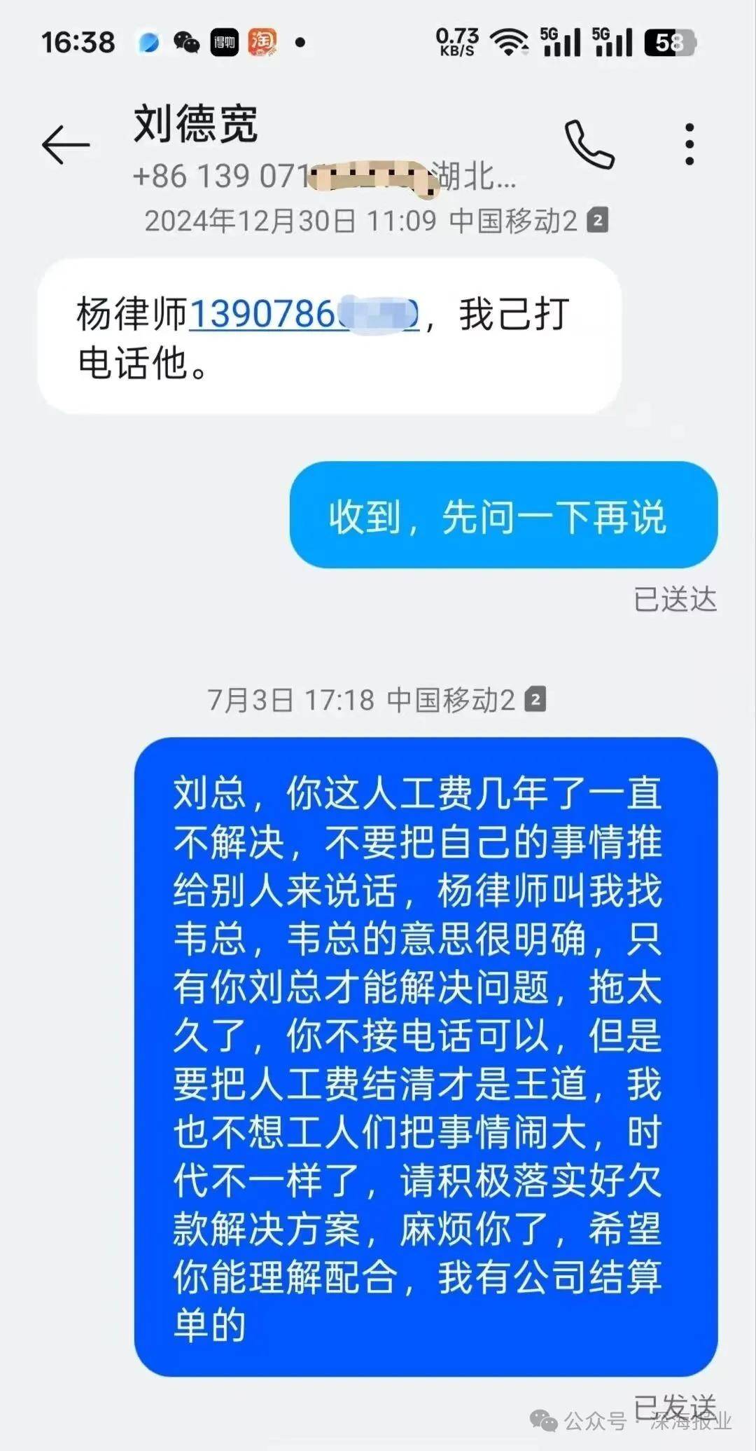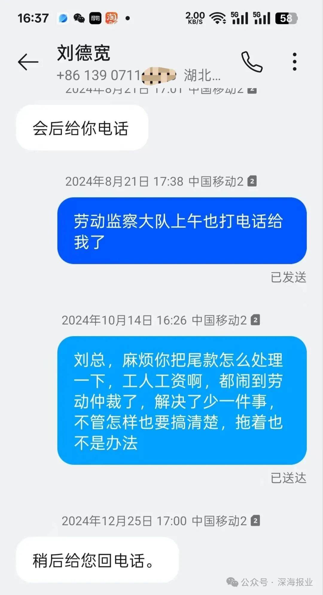 2024年8月份,我们先后向市长热线、防城港市住建局监管科、劳动监察等部门反映问题。但劳动监察部门回复称,刘德宽没签字,他们也无法办理。
