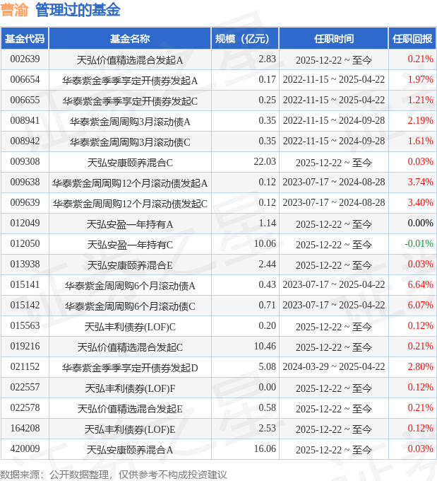 曹渝女士:中国国籍,硕士研究生,2011年至2012年供职于嘉实基金研究部,2012年至2014年供职于泰康之家(北京)投资有限公司,2014年至2016年供职于中金公司固定收益部,2016年9月进入华泰证券(上海)资产管理有限公司从事固定收益产品和混合型产品的投资管理工作。2022年11月15日起担任华泰紫金周周购3个月滚动持有债券型证券投资基金基金经理。2023年07月17日起担任华泰紫金周周购12个月滚动持有债券型发起式证券投资基金基金经理。2023年07月17日至2025年4月22日担任华泰紫金周周购6个月滚动持有债券型发起式证券投资基金基金经理。曾任华泰紫金季季享定期开放债券型发起式证券投资基金基金经理。