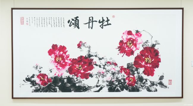 转过展厅拐角,一片绚烂的“牡丹”映入眼帘,画布上的牡丹或浓墨重彩、雍容华贵,或淡彩轻施、清雅脱俗,色彩的碰撞间透着别样的生命力。“2024年是新中国成立75周年,也是我在香港创业30年、上市公司20年的重要节点。”轻轻拂过画面,指尖抚过颜料的肌理,“我想以牡丹为媒,给生命一个郑重的记忆,也向这个伟大的时代致敬。”传统水墨的色彩起初难以承载她心中对生命的炽热渴望,她便大胆突破,将西方丙烯颜料融入水墨创作,让牡丹花瓣更具层次与张力,这种创新被广东省文联原主席许钦松赞为“根植于东方文脉的破界之美”。画完最后一幅牡丹时,恰逢黎明破晓,朝霞漫过窗棂,她灵感迸发挥笔写下《满江红·牡丹颂》,将对生命的热爱、对时代的礼赞尽数倾注其中。